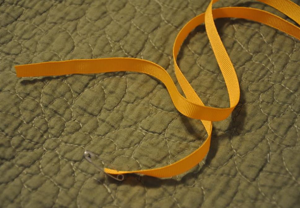 9. Now it is time to pass the ribbon through the neck-hem. Measure and cut two ribbons of the same length. Take one ribbon and pass it through the front hem - one sleeve to the other. Take the second ribbon and do the same for the back. A good tip is to use a safety-pin to pass the ribbon through the hem.